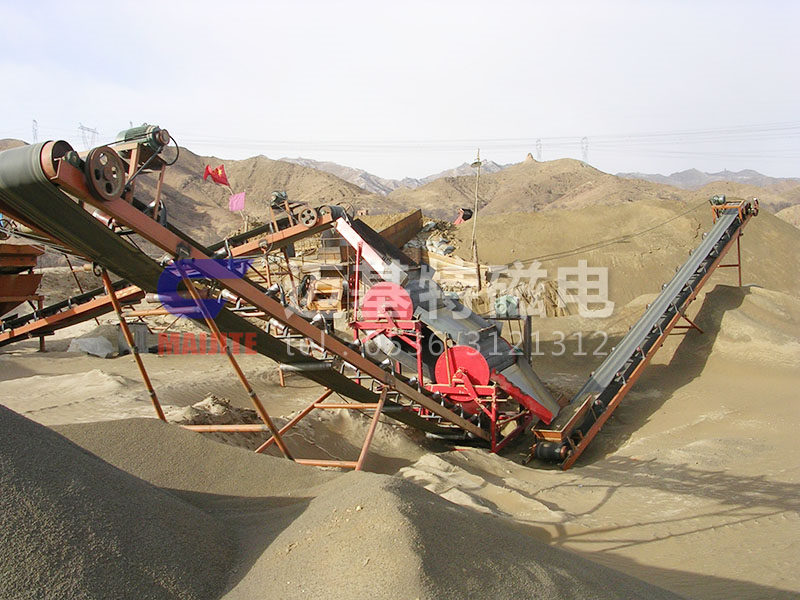 被皮帶輸送機(jī)輸送的散狀物料,通過安裝在尾部支架上的磁選機(jī)(即旋轉(zhuǎn)的直流磁鐵)時(shí),物料中的鐵磁雜物被吸,由棄鐵膠帶將鐵磁雜物拽至電動滾筒卸下,...